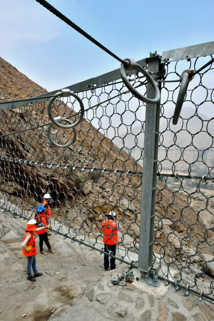 Una barrera dinámica contra flujo de detritos es un sistema de componentes definidos por el fabricante, con la capacidad de retener una determinada cantidad de material, causada por impactos dinámicos de flujos de detritos mixtos/granulares o de lodo. La calibración del modelo y resistencia de cada uno de sus componentes son verificados en ensayos de campo por impactos de flujos de detritos, generados naturalmente en Suiza (Quebrada Illgraben), bajo la supervisión y aprobación del WSL Swiss Federal Research Institute, Suiza. A diferencia de los muros convencionales rígidos de concreto o mampostería, las barreras dinámicas contra flujo de detritos son sistemas flexibles, conformados por redes de anillos circulares que absorben la energía de impacto y que es trasmitida a los anclajes perimetrales del cauce. El concepto multinivel nos permite plantear más de una estructura a lo largo del cauce, tal como se realizó en las Quebradas de Chosica, con el fin de disipar la energía de manera gradual y mitigar el fenómeno de los huaycos en las zonas intervenidas.